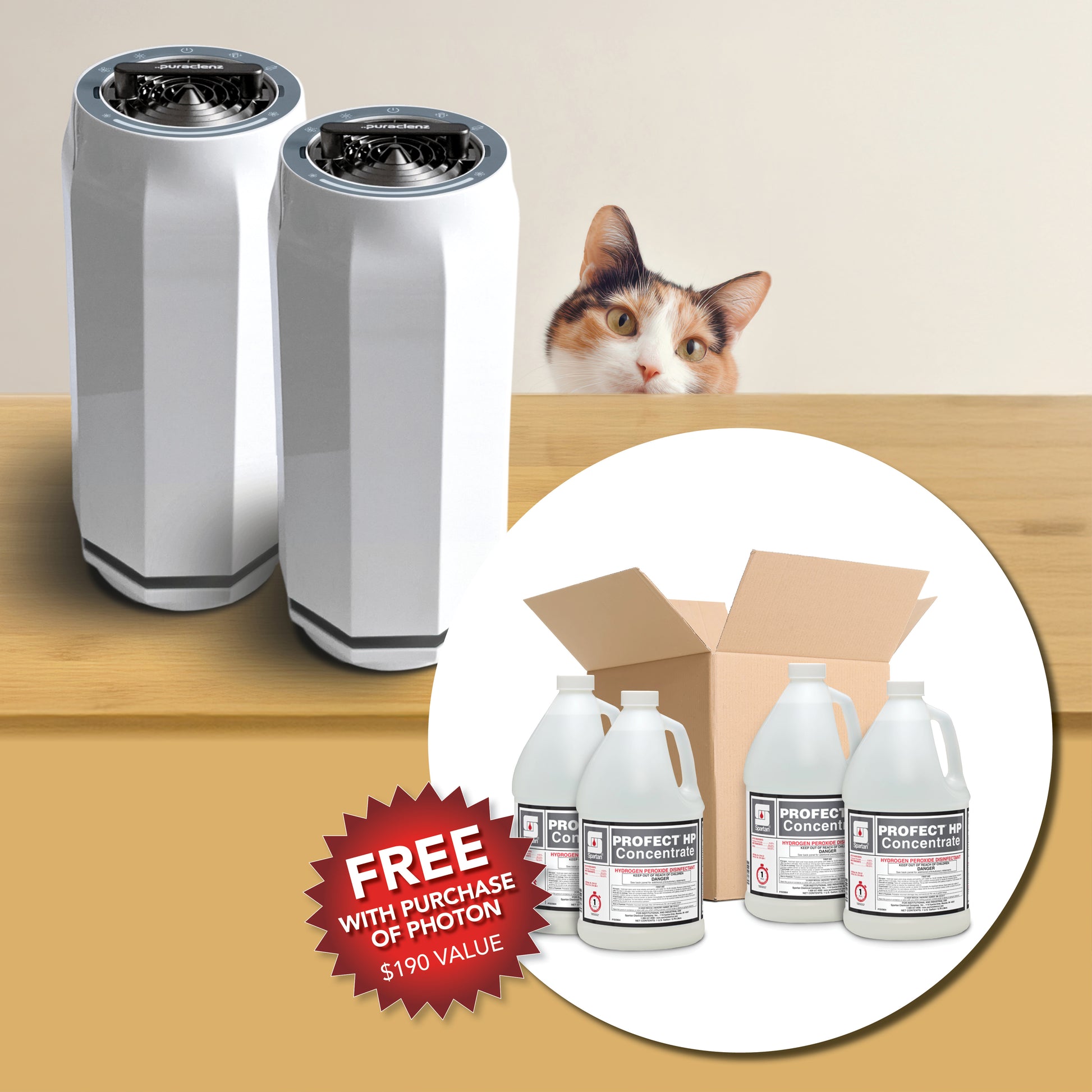 Promo Two consists of two Q63000x Ogenashield Air and Surface Purifiers by Puraclenz and one case (4 jugs) of Spartan Profect Concentrate D11009-001